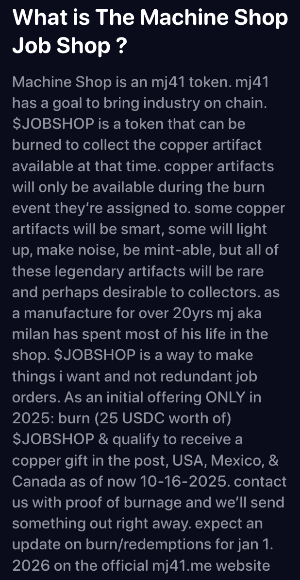 Be among the first to participate in the $JOBSHOP ecosystem. Get early access to copper artifact redemptions and platform updates.